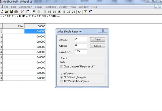 网关从Modbus主站获取数据,并将其存储在4xxxx区域。我们使用Modbus轮询软件手动修改4xxxx寄存器的值,如下图所示: