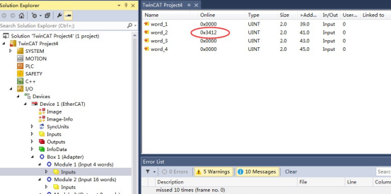首次上传的数据可以在TWINCAT软件中进行监控,数据修改成功。