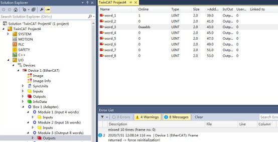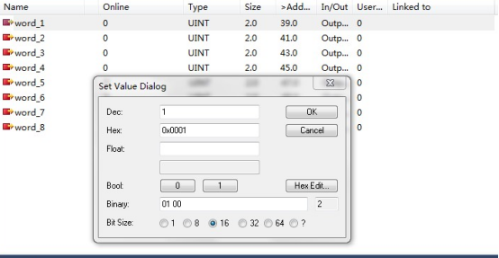 手动修改TWINCAT软件上的输出数据值,如下图所示: