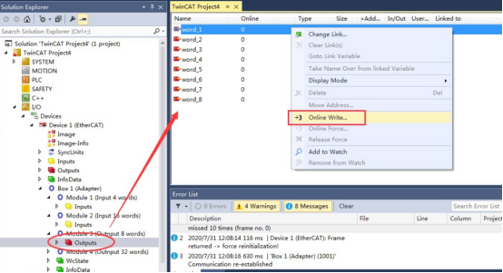 (7) 在ETHERCAT主站软件上,单击左侧项目树中的第一个输出。在主窗口中,右键单击数据,然后选择“联机写入”以修改实时数据值。