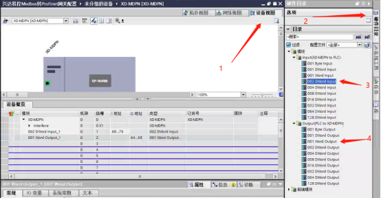 在设备视图中点击硬件目录,添加读写数据长度,本案例选择读2个数据长度,写1个数据长度