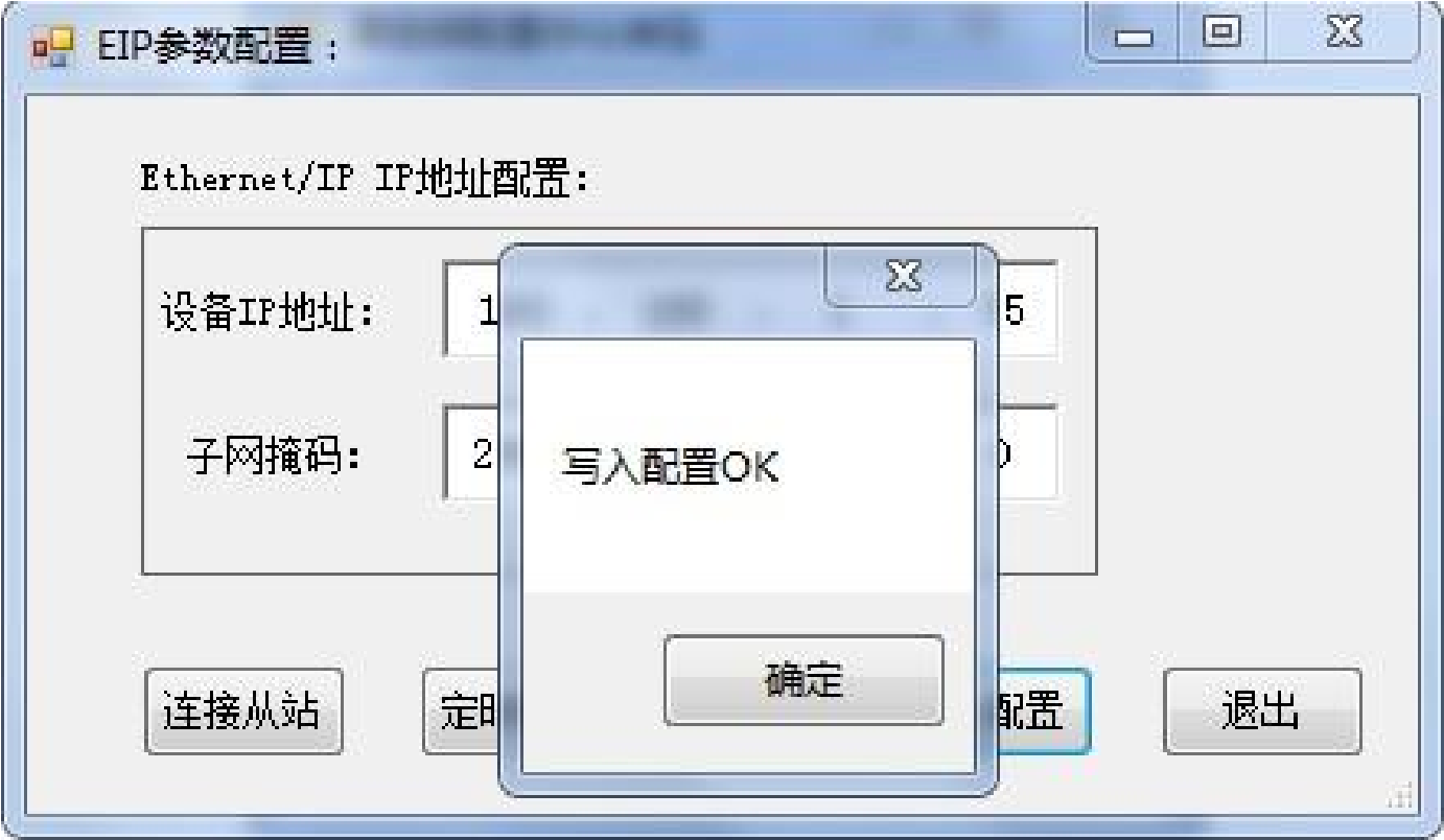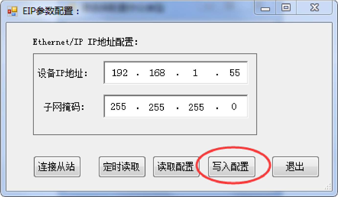 (7)填写用户需要的 IP 地址和子网掩码,点击“写入配置”按钮: