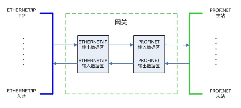 EtherNET转Profinet网关分别从Profinet一侧和EtherNET一侧读写数据,存入各自的缓冲区,网关内部将缓冲区的数据进行交换,从而实现两边数据的传输。