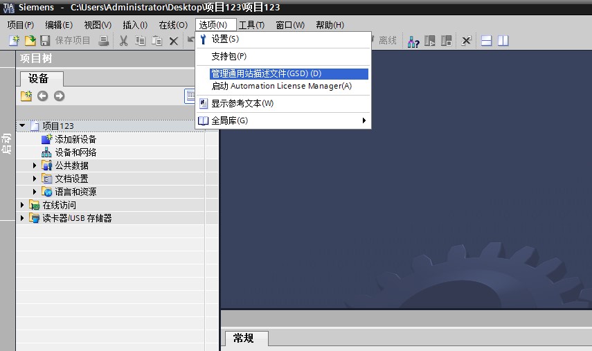 1、在博途中新建一个项目,通过“选项”——“管理通用站描述文件”添加网关的 GSD 文件。
