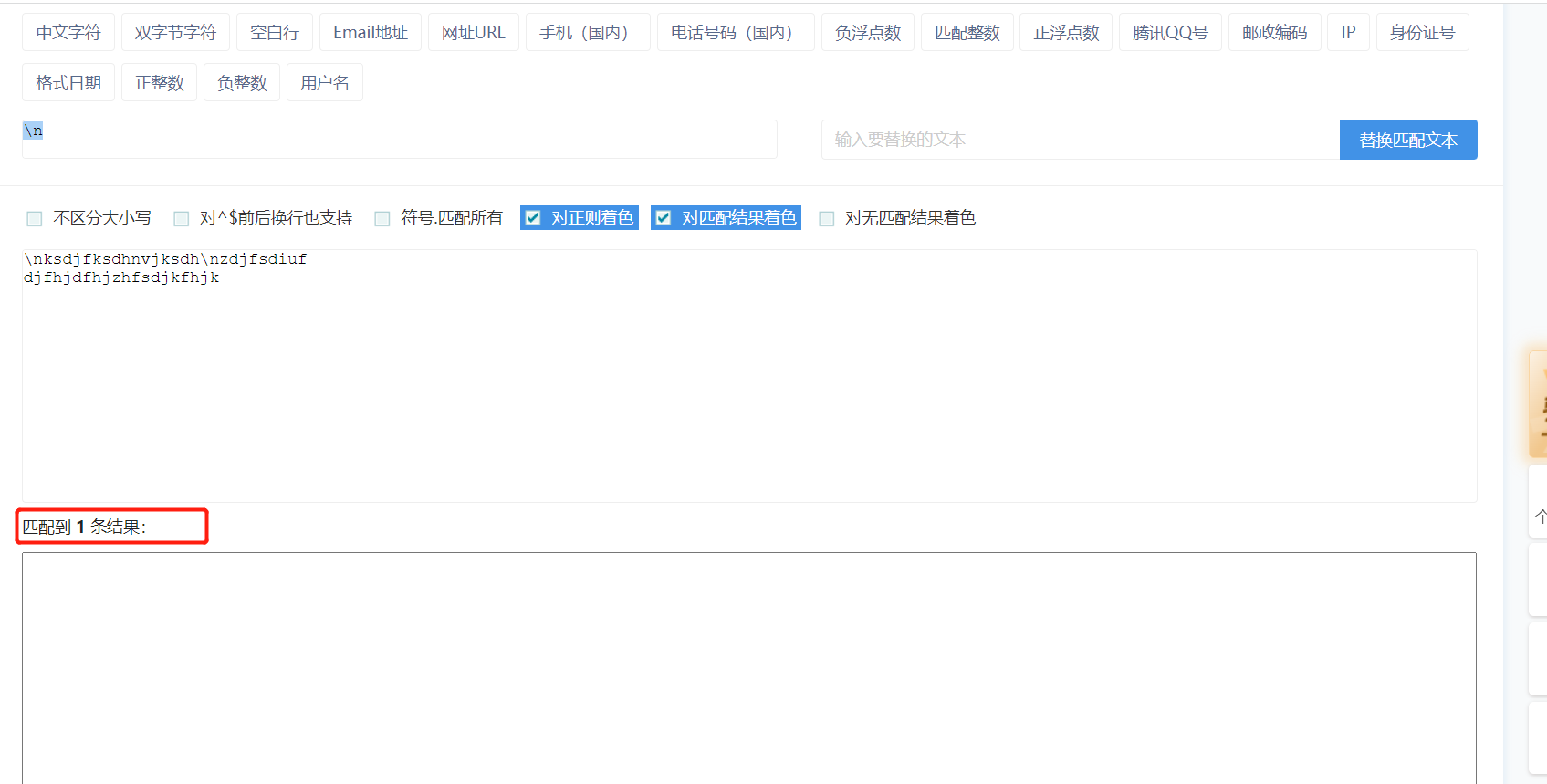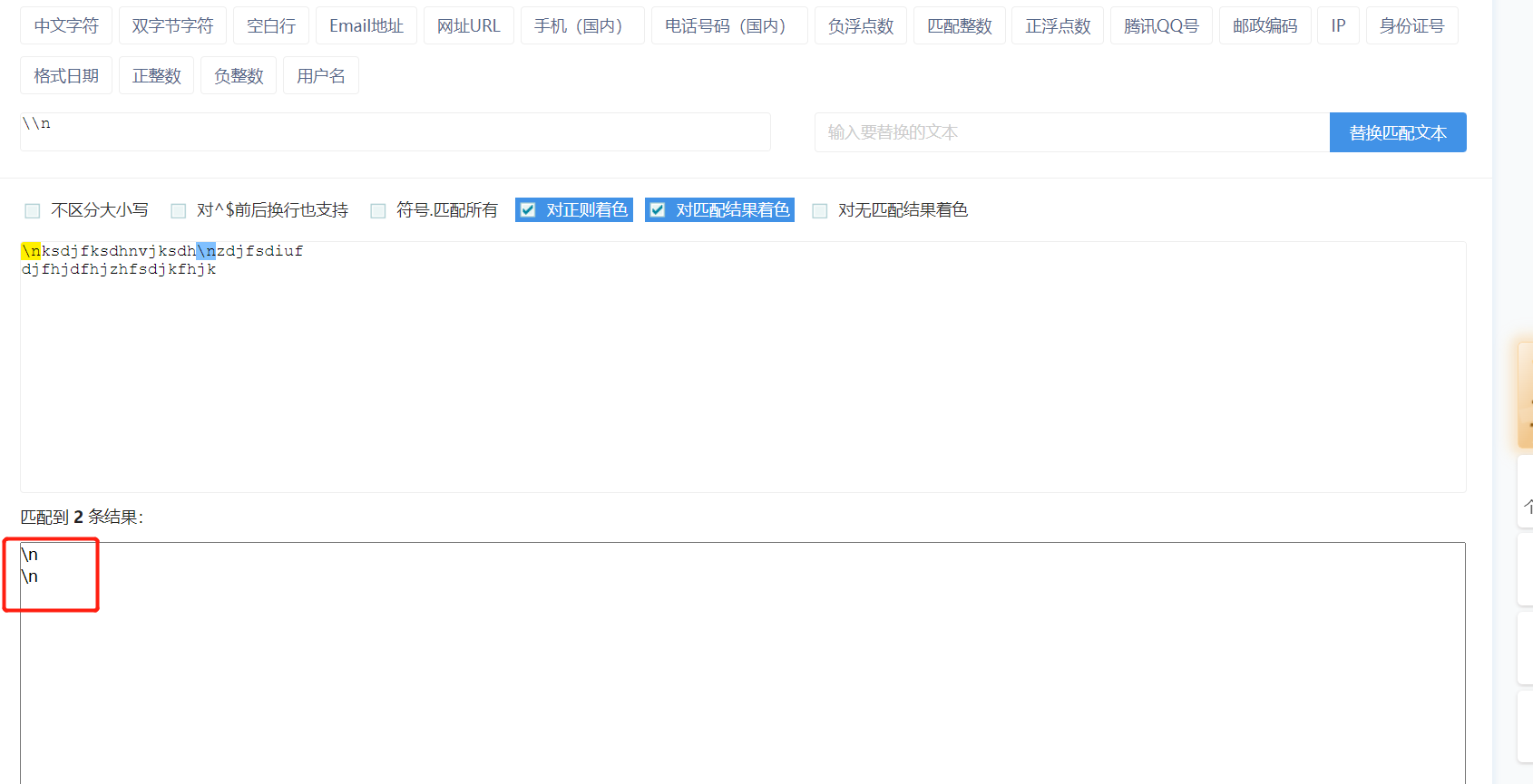 \n 匹配的是换行符:在文本中不会显示匹配结果,但是会显示匹配到×条结果