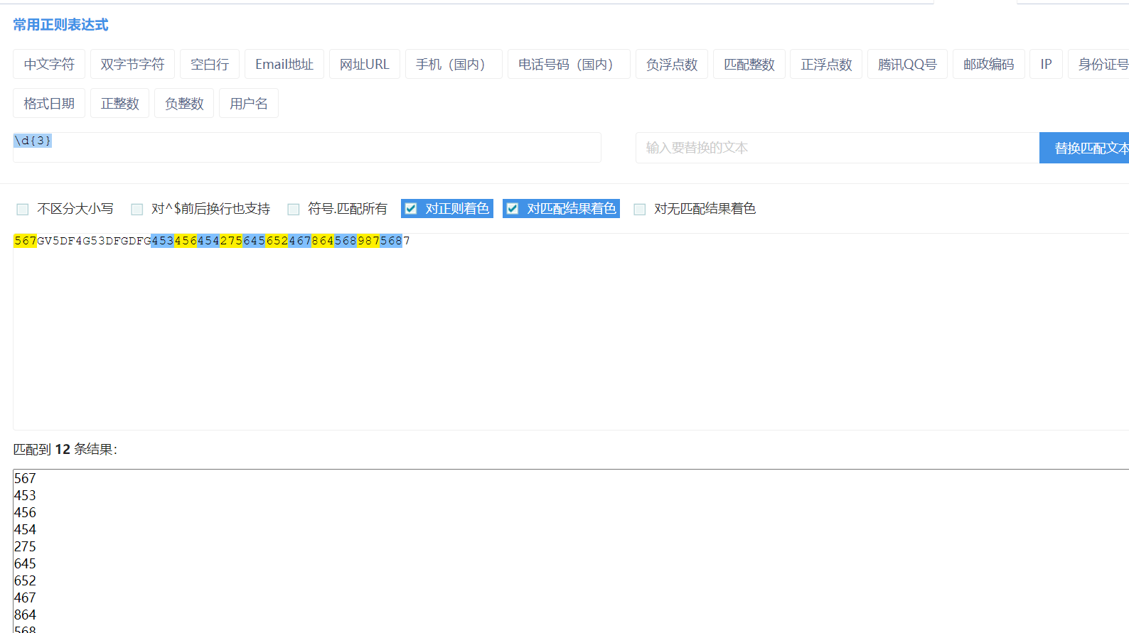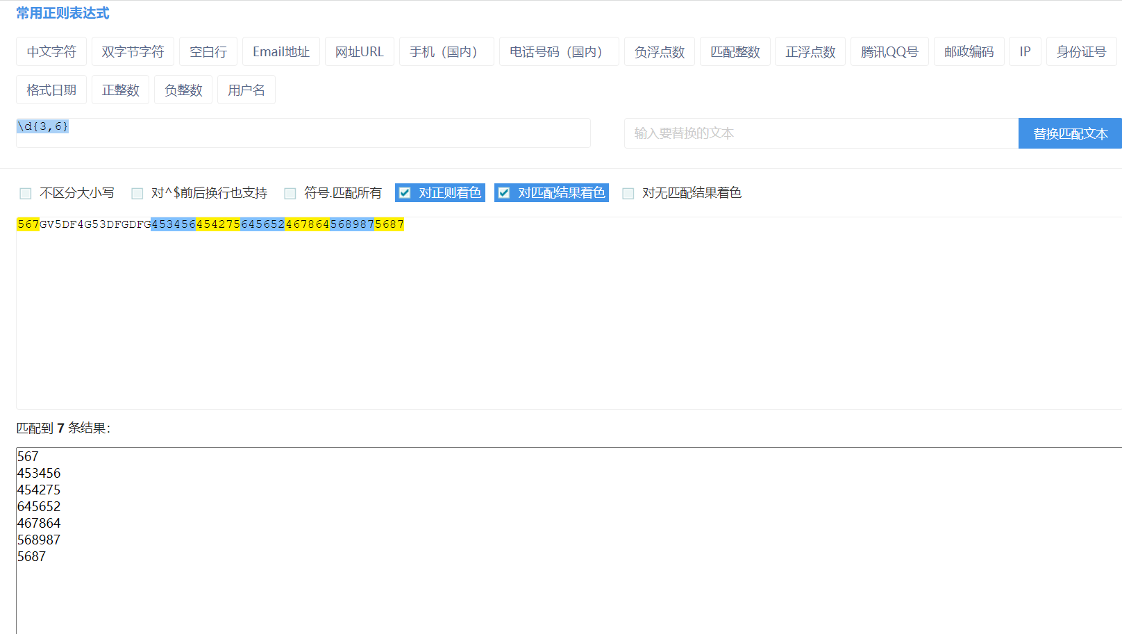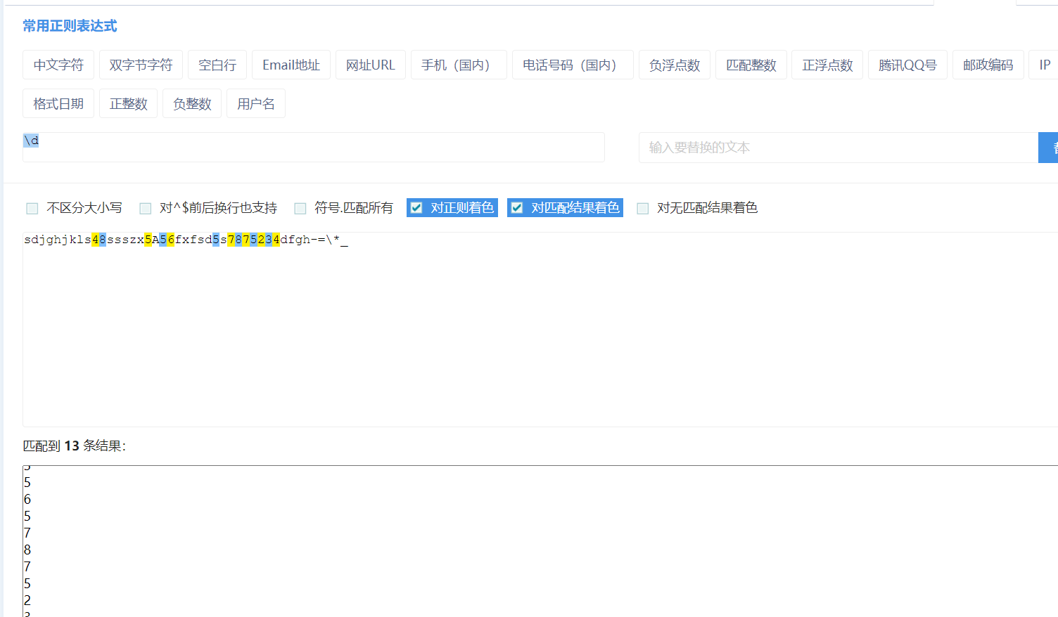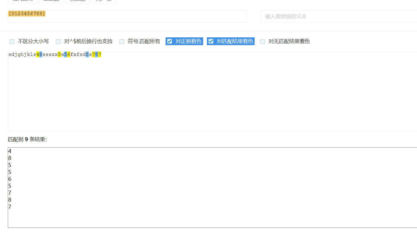 [0123456789]:匹配0-9任意一个数字(全写):文本中所有的数字会一一匹配,一次只能匹配一个字符