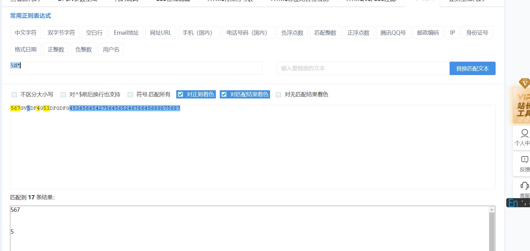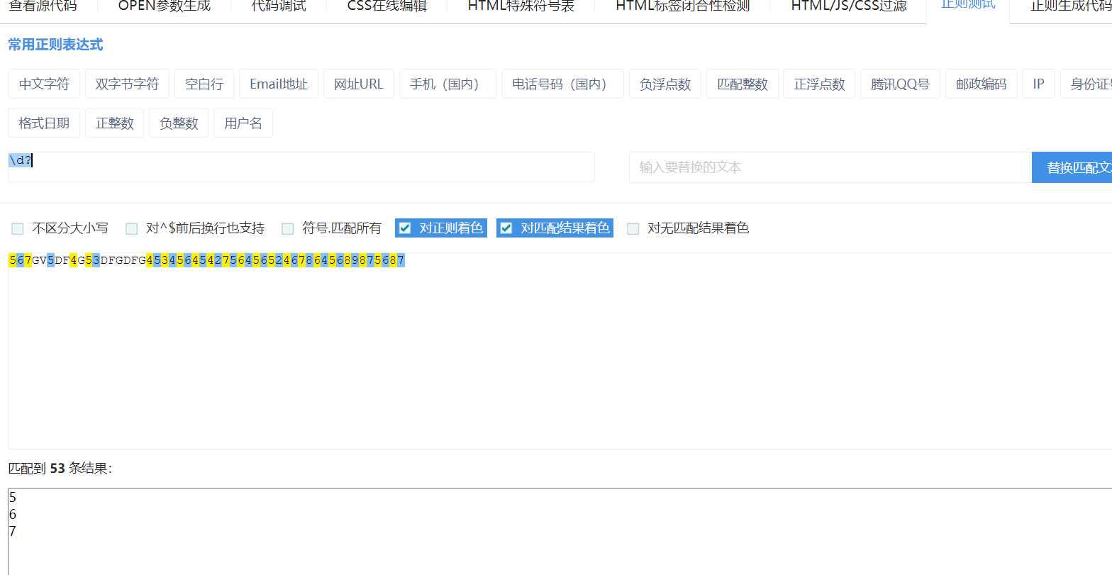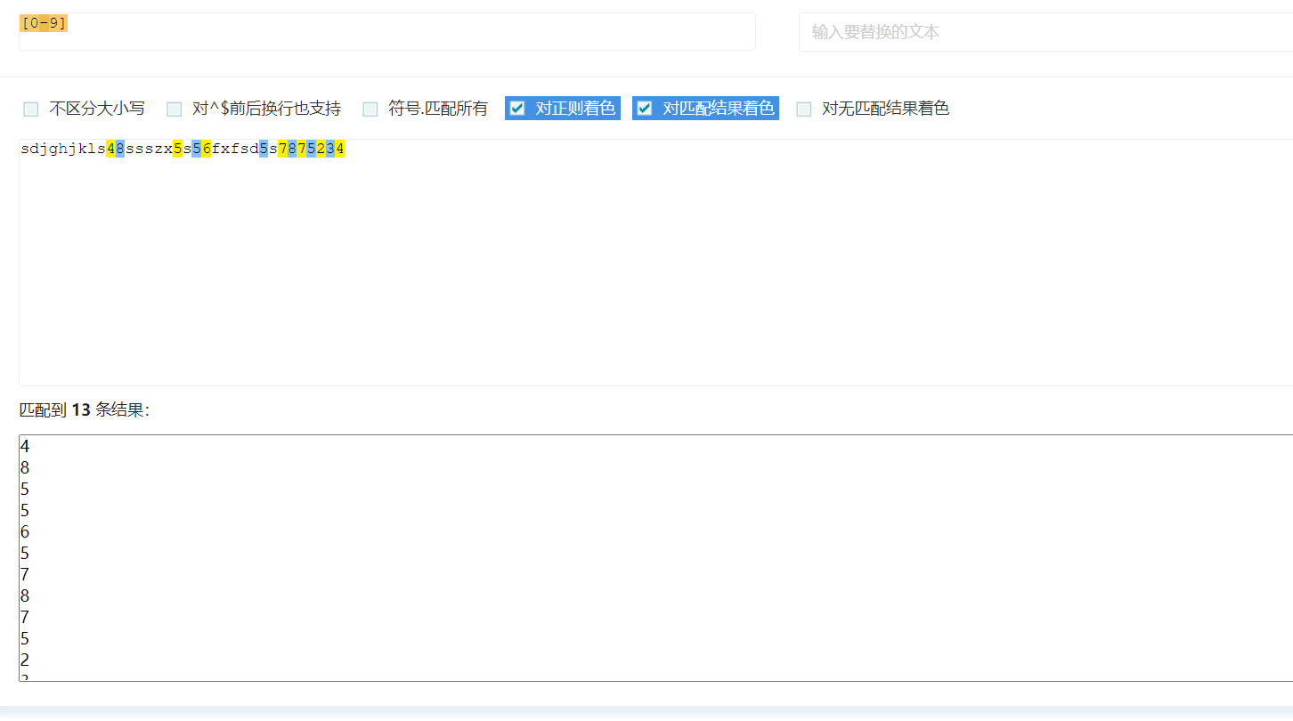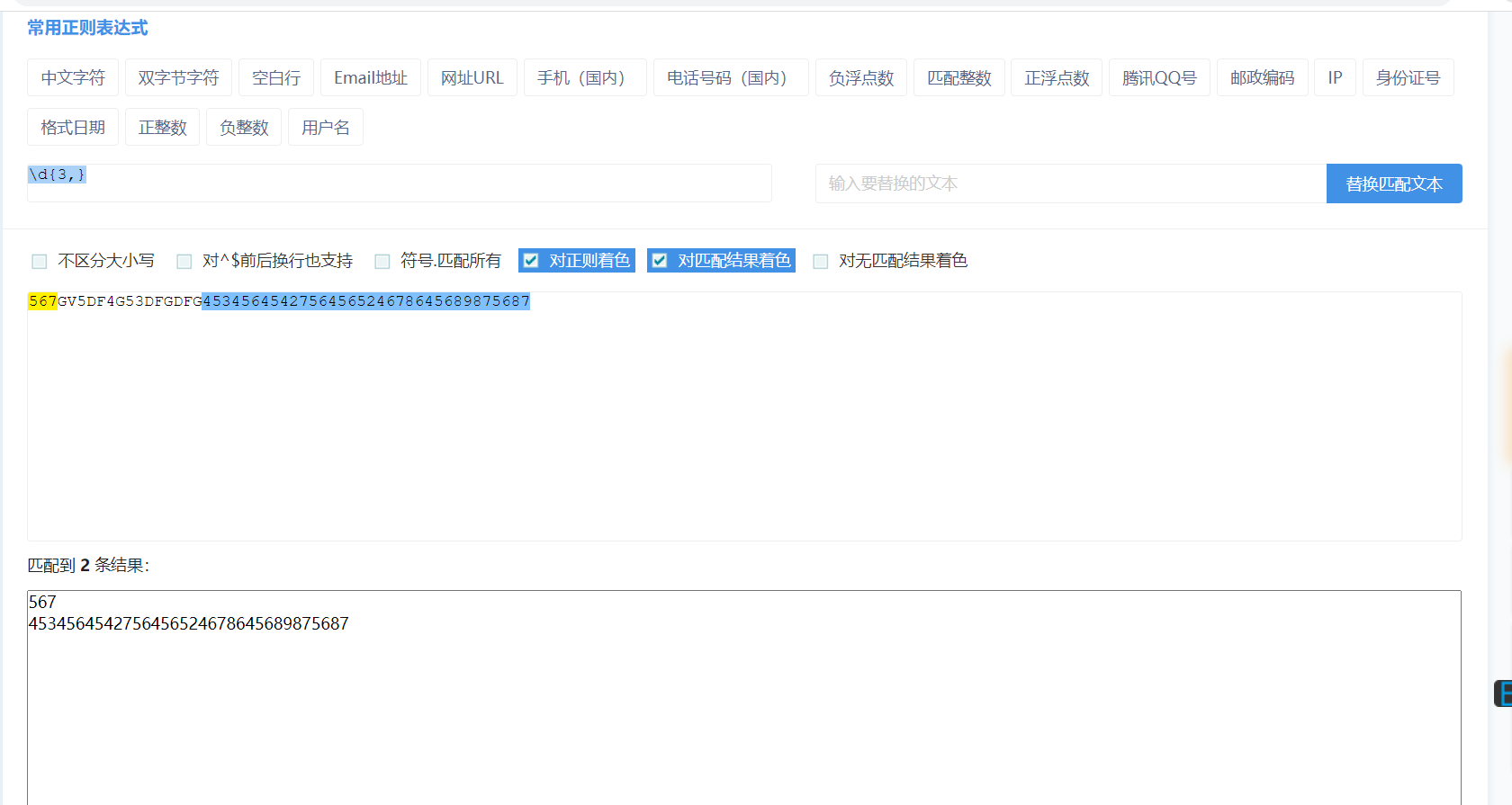 [0123456789]:匹配0-9任意一个数字(全写):文本中所有的数字会一一匹配,一次只能匹配一个字符
