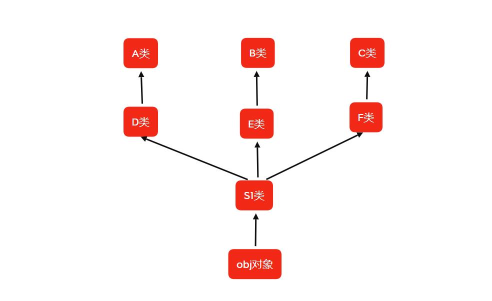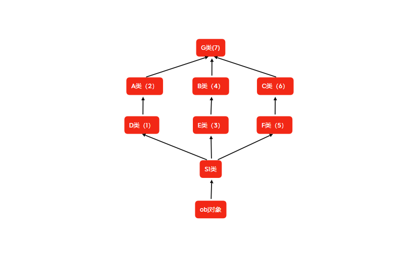 菱形查找顺序为先从对象你名称空间中查找,再到类名称空间,再到父类名称空间。父类名称空间查找顺序从左到右,走道菱形交汇点之前停止,直到所有的类都找完,再找交汇点的类。