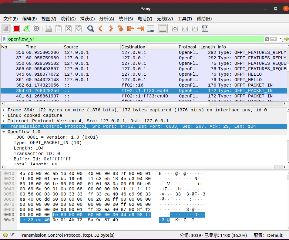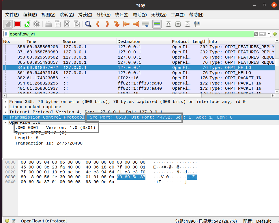 - 能够运用 wireshark 对 OpenFlow 协议数据交互过程进行抓包;
