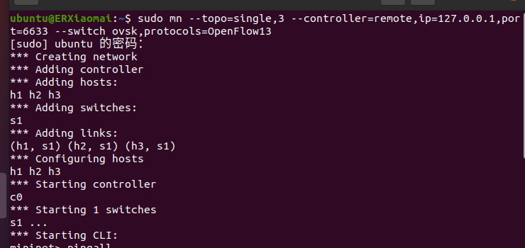 利用Mininet平台搭建下图所示网络拓扑,并连接OpenDaylight控制器;
