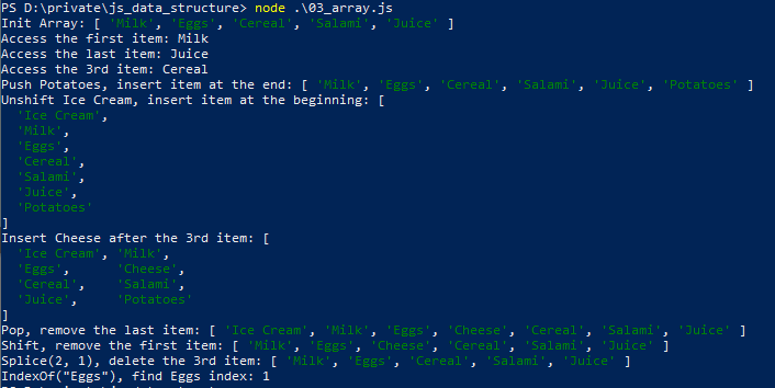 // Create our array! let groceries = ["Milk", "Eggs", "Cereal", "Salami", "Juice"]; console.log("Init Array:", groceries); // Access the first item let first = groceries[0]; console.log("Access the first item:", first); // Access the last item let last = groceries[groceries.length - 1]; console.log("Access the last item:", last); // Access the 3rd item let cereal = groceries[2]; console.log("Access the 3rd item:", cereal); // Insert item at the end groceries.push("Potatoes"); console.log("Push Potatoes, insert item at the end:", groceries); // Insert item at the beginning groceries.unshift("Ice Cream"); console.log("Unshift Ice Cream, insert item at the beginning:", groceries); // Insert item after the 3rd item groceries.splice(3, 0, "Cheese"); console.log("Insert Cheese after the 3rd item:", groceries); // Remove last item groceries.pop(); console.log("Pop, remove the last item:", groceries); // Remove first item groceries.shift(); console.log("Shift, remove the first item:", groceries); // Delete the 3rd item groceries.splice(2, 1); console.log("Splice(2, 1), delete the 3rd item:", groceries); // Find a particular item let foundIndex = groceries.indexOf("Eggs"); // 1 console.log("IndexOf(\"Eggs\"), find Eggs index:", foundIndex); // Iterate through each item let itemToFind = -1; for (let i = 0; i < groceries.length; i++) { let currentItem = groceries[i]; if (currentItem == "Salami") { itemToFind = i; } }