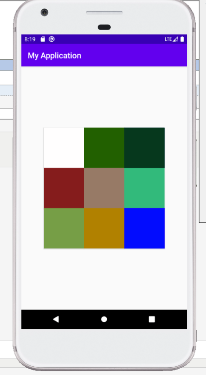 <?xml version="1.0" encoding="utf-8"?> <RelativeLayout xmlns:android="http://schemas.android.com/apk/res/android" xmlns:app="http://schemas.android.com/apk/res-auto" xmlns:tools="http://schemas.android.com/tools" android:layout_width="match_parent" android:layout_height="match_parent" tools:context=".MainActivity"> <Button android:id="@+id/a1" android:layout_width="100dp" android:layout_height="100dp" android:layout_centerInParent="true" android:background="#977A66" /> <Button android:id="@+id/a2" android:layout_width="100dp" android:layout_height="100dp" android:layout_above="@id/a1" android:layout_alignRight="@+id/a1" android:background="#206005" android:layout_alignEnd="@+id/a1" /> <Button android:id="@+id/a3" android:layout_width="100dp" android:layout_height="100dp" android:layout_below="@id/a1" android:layout_alignRight="@+id/a1" android:background="#B1810A" android:layout_alignEnd="@+id/a1" /> <Button android:id="@+id/a4" android:layout_width="100dp" android:layout_height="100dp" android:layout_above="@id/a1" android:layout_toLeftOf="@+id/a1" android:background="#FFFEFE" android:layout_toStartOf="@+id/a1" /> <Button android:id="@+id/a5" android:layout_width="100dp" android:layout_height="100dp" android:layout_above="@id/a1" android:layout_toRightOf="@+id/a1" android:background="#123F6C" android:layout_toEndOf="@+id/a1" /> <Button android:id="@+id/a6" android:layout_width="100dp" android:layout_height="100dp" android:layout_below="@id/a1" android:layout_toLeftOf="@+id/a1" android:background="#769E46" android:layout_toStartOf="@+id/a1" /> <Button android:id="@+id/a7" android:layout_width="100dp" android:layout_height="100dp" android:layout_below="@id/a1" android:layout_toRightOf="@+id/a1" android:background="#B513B5" android:layout_toEndOf="@+id/a1" /> <Button android:id="@+id/a8" android:layout_width="100dp" android:layout_height="100dp" android:layout_toLeftOf="@id/a1" android:layout_alignBottom="@+id/a1" android:background="#851C1C" android:layout_toStartOf="@id/a1" /> <Button android:id="@+id/a9" android:layout_width="100dp" android:layout_height="100dp" android:layout_toRightOf="@id/a1" android:layout_alignBottom="@+id/a1" android:background="#33BA7B" android:layout_toEndOf="@id/a1" /> </RelativeLayout>