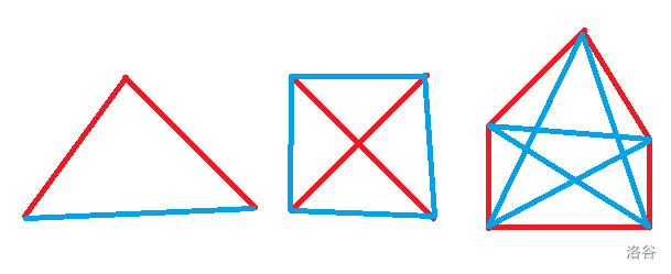 定义 2.6.1:给定平面上 \(n\) 个点,用线段将这些点连接起来,这样的图成为 \(K_n\) 图,要求任意两点之间均有边,则共有 \(C_n^2=\dfrac{n(n-1)}2\) 条边。
