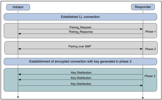 - 配对(paring):包括配对能力交换、设备认证以及STK(short-term Key)生成、加密连接及机密信息分发等过程,配对的目的有三个:加密连接、认证设备、生成密钥