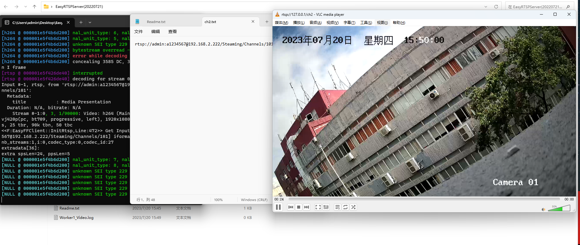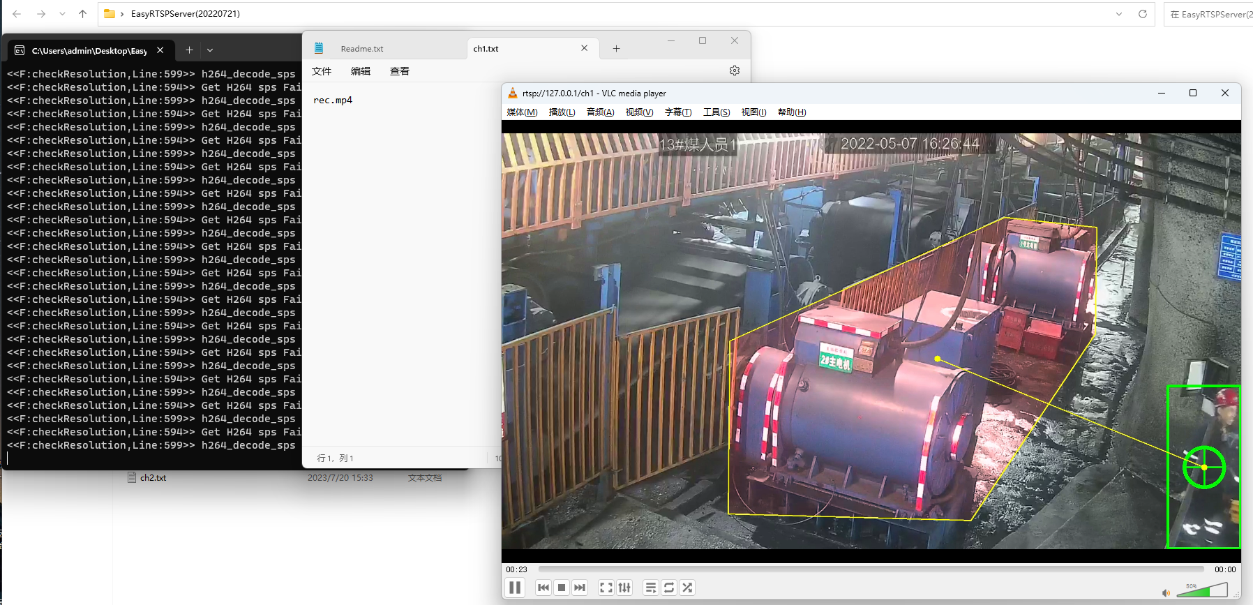 操作方法: 1、双击启动EasyStreamingServer.exe 2、在当前文件夹放入MP4文件,例如:rec.mp4,再新建一个ch1.txt,在txt文件中填入:rec.mp4,保存,关闭; 3、在VLC中访问播放:rtsp://192.168.99.10/ch1,其中192.168.99.10是EasyStreamingServer所在机器的IP,如果是本机,也可以直接访问:rtsp://127.0.0.1/ch1 4、如果是需要代理网络视频流,例如流地址是rtsp://admin:a1234567@192.168.2.222/Steaming/Channels/101,再新建一个ch2.txt,在txt文件中填入:rtsp://admin:a1234567@192.168.2.222/Steaming/Channels/101,保存,关闭; 5、在VLC中访问播放:rtsp://192.168.99.10/ch2,其中192.168.99.10是EasyStreamingServer所在机器的IP,如果是本机,也可以直接访问:rtsp://127.0.0.1/ch2