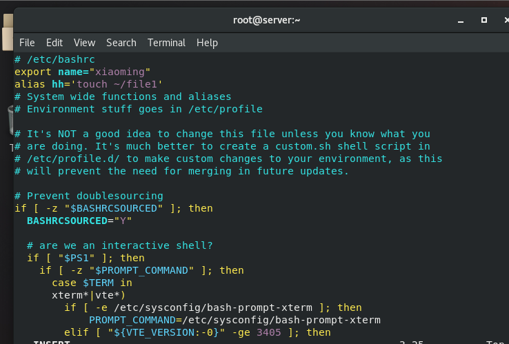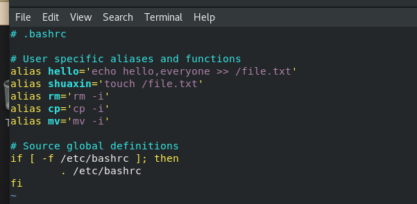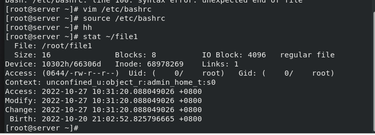 (1)写一个所有用户都生效的命令别名为hh,每一个用户输入这个命令可在家目录创建一个file1文件