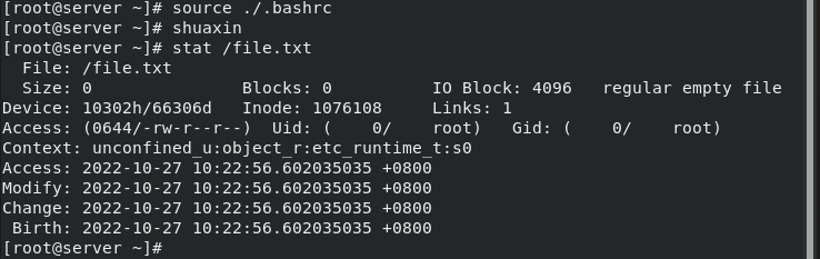 (2)写一个命令shuaxin,实现的功能为每输入一次命令,file.txt文件的所有时间就更新位当前时间