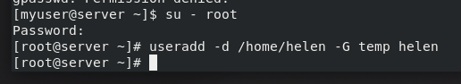 3:添加一新用户helen并设置其用户主目录/helen,密码为空,并将temp组群作为用户helen的附加组群