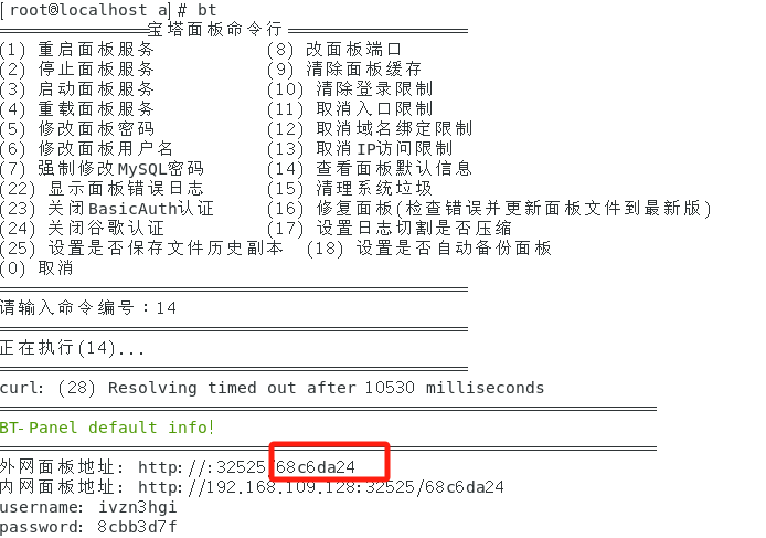 进入虚拟机,输入命令bt启动宝塔命令面板,查看面板默认信息