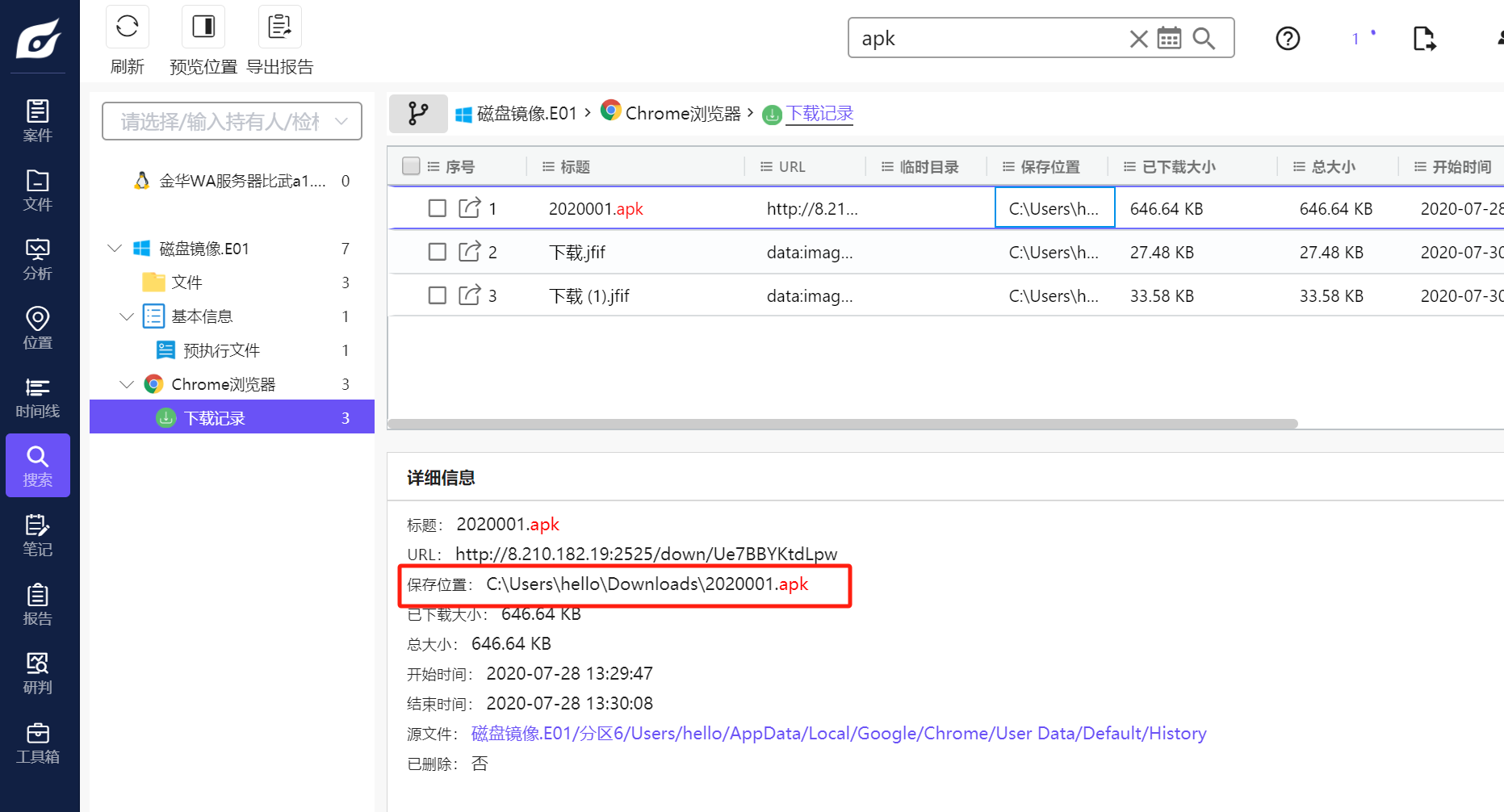查找到路径为\Users\hello\Downloads\2020001.apk