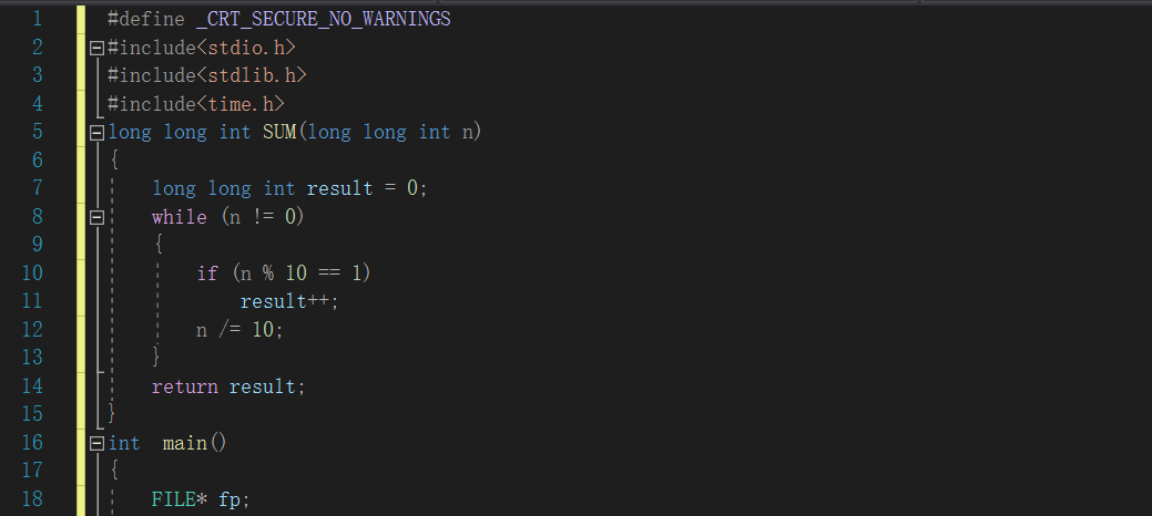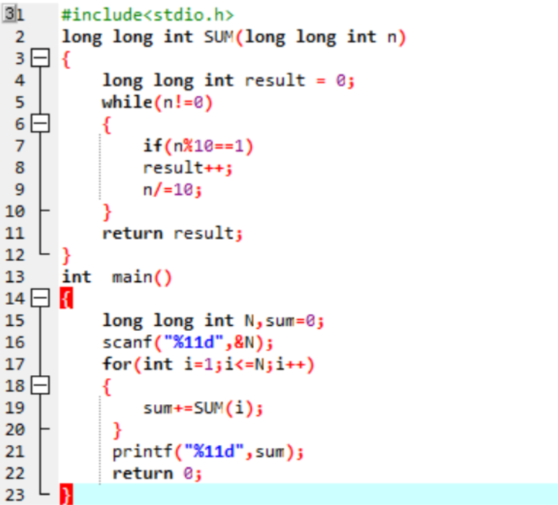 | 解题思路:从1开始到N的所有整数中出现1的个数,没有逻辑可循,先定义函数,运用循环语句,利用求模和除以十判断1的个数,然后累计。 | |