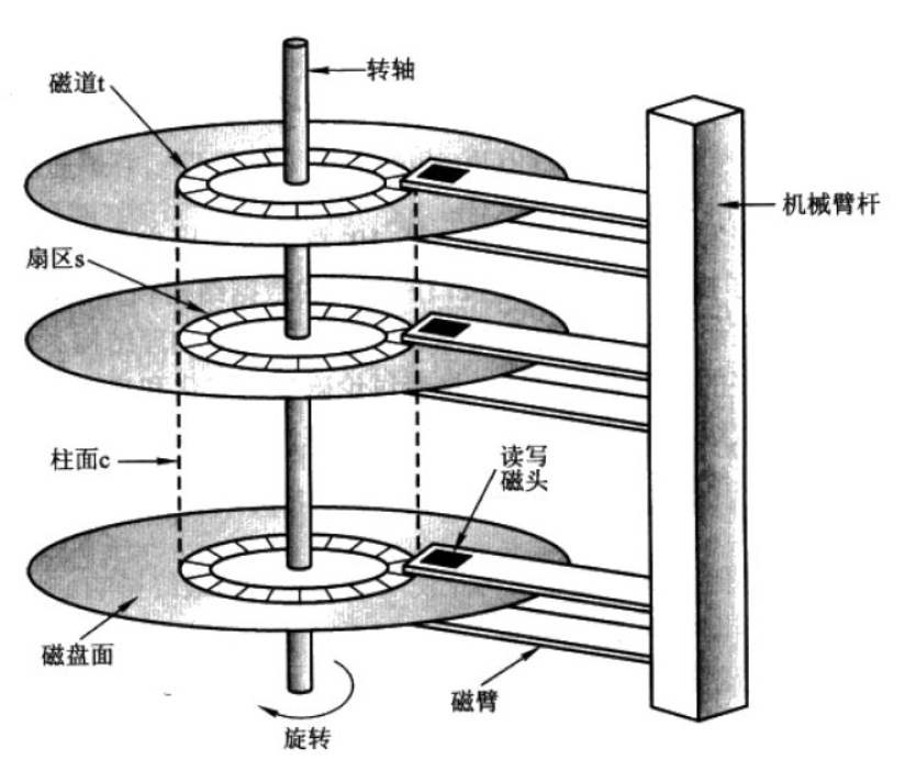 磁盘表面上看是一堆盘,一堆可以共同伸缩的磁头组成的。