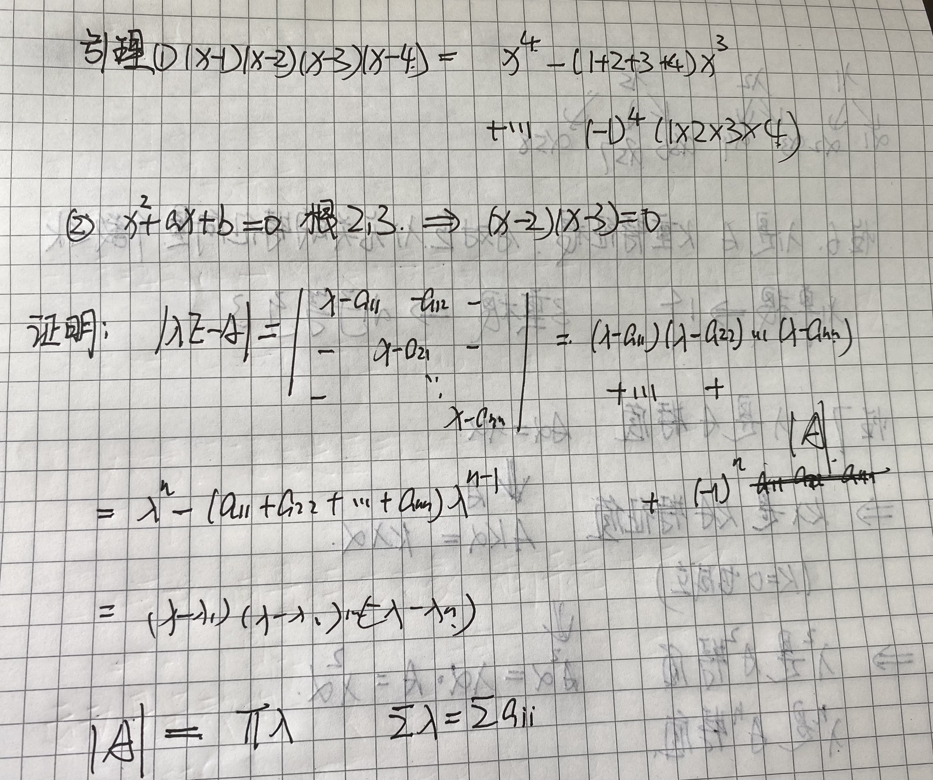 n阶方阵A的特征值有λ1~λn,则∑λ=∑aii,Πλ=|A|