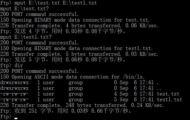 7.!xx是跳出ftp模式,在命令行中执行xx命令,比如说使用lcd切换到本地另外一个文件夹之后,你想看当前文件夹下有什么文件,就可以使用!dir来实现。