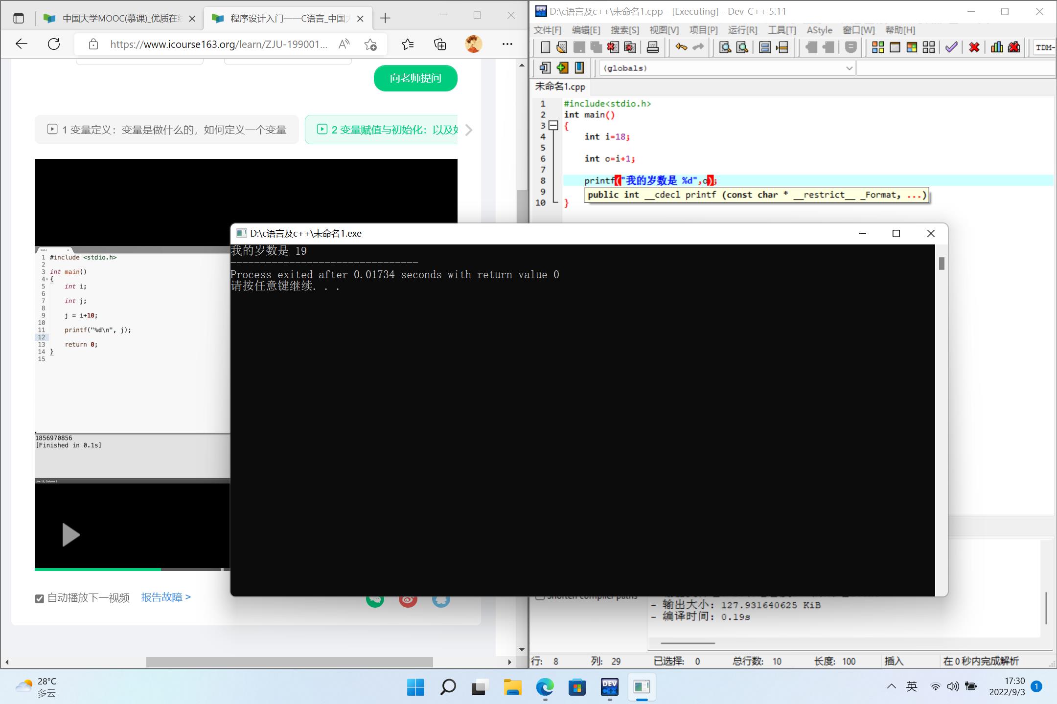 变量设置形式为 int X=数字 然后镶嵌入固定格式like: #include<stdio.h> 回车键 int main() 回车键 {int A=18; 回车键 int B=A+1; 回车键 printf("我的年龄是%d\n ",B); 回车键 return 0; }