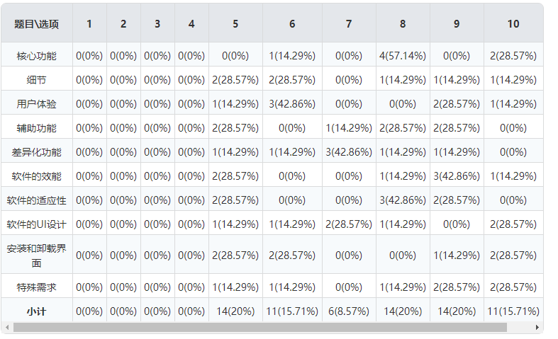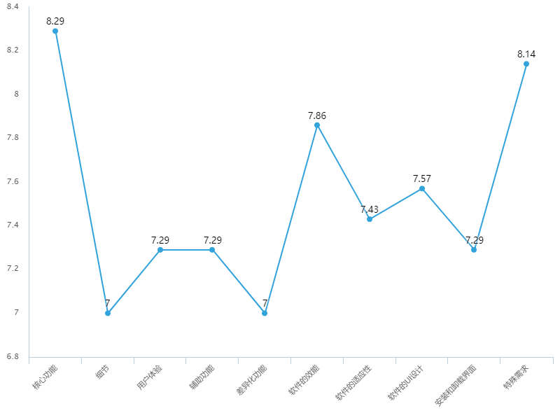 通过问卷调查,我们对于各项评分得出了以下信息,并计算了平均得分。