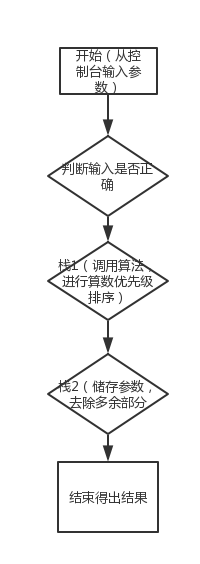 设计过程:代码中共有两个栈,一个运算符栈,一个运算数栈,其中一个用来比较算数优先级,另一个负责运算,共有5种函数,关系为平等关系,相互独立又可以同时在一个运算式中