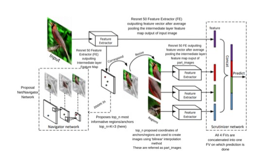 3.对于是否是制式皮鞋,是皮鞋的细类别分类问题,归属图像细粒度识别任务,采用顶会18年一篇提出的NTS模型,使用三个协同工作的“agent”提取局部化物体中信息最丰富的区域,将信息区域的特征与全图像融合将获得更好的性能。