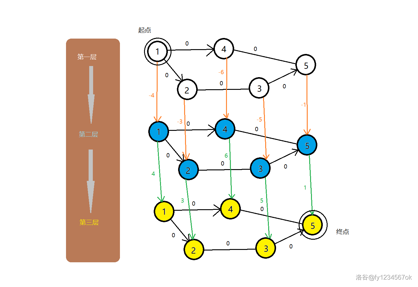 我们假设现在在第i层,点u和点v之间有一条权值w的边,对于下一层,即i+1层,u'与v'之间仍是有一条权为w的边,且对于u与v'之间应该加上一条边权为w/2的边。所以如果每一层有m条边,第i层和第i+1层之间也一定是有m条边。显然层数就是k,每上下层都有一个w/2,走到第k层的终点即可完成最小用时。