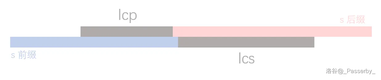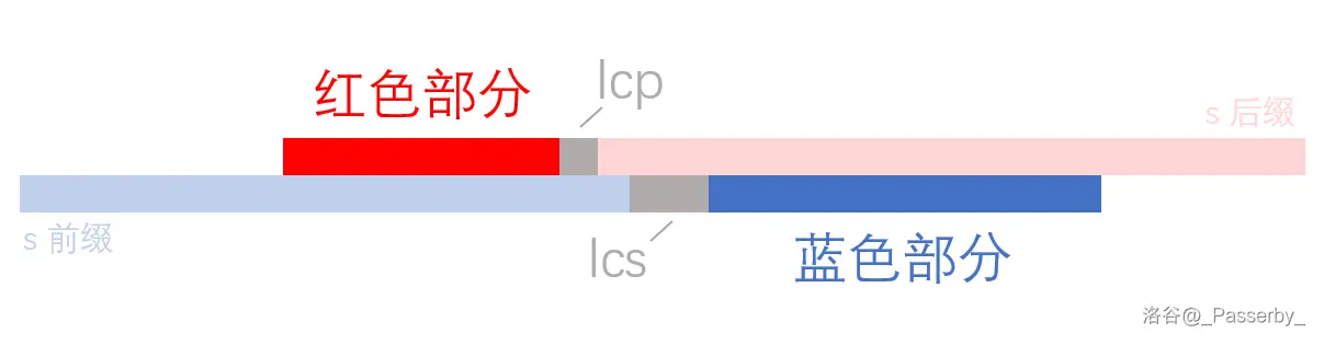 你会发现,红色部分不超过 \(\text{lcp}\),蓝色部分不超过 \(\text{lcs}\),即:
