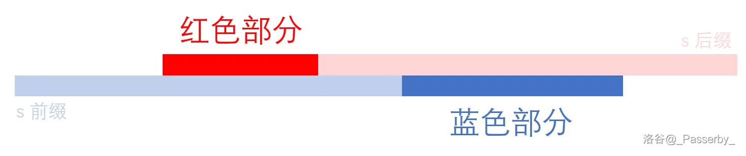 不妨换个角度入手,观察上面的例子,你会发现红色部分(就是 \(\color{red}\texttt{a}\))是 \(t\) 的一段前缀,蓝色部分(就是 \(\color{blue}\texttt{ba}\))是 \(t\) 的一段后缀。再观察它们在 \(s\) 中出现的位置,\(\color{red}\texttt{a}\) 是 \(s\) 的后缀 \({\color{red}\texttt{a}}\texttt{bbaa}{\color{blue}\texttt{ba}}\) 的一段前缀,\(\color{blue}\texttt{ba}\) 是 \(s\) 的前缀 \(\texttt{a}{\color{red}\texttt{a}}\texttt{bbaa}{\color{blue}\texttt{ba}}\) 的一段后缀。