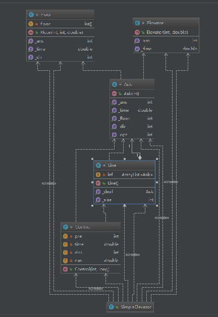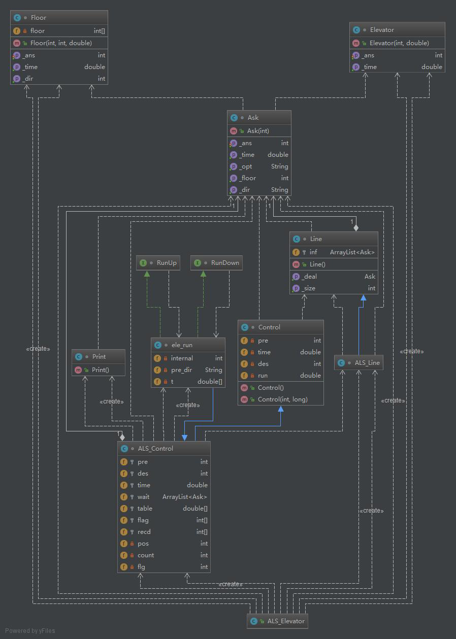 第三次作业是第二次的加强版,基于FAFS调度策略且具有捎带功能的单部ALS电梯,以下是第三次作业程序的度量和类图结构: