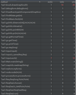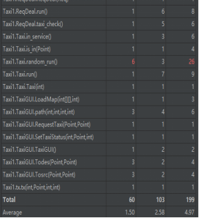这是出租车系列的第一次作业,主要是将整个打车服务看成一个系统,考虑其与外部环境的交互设计,即出租车和乘客。系统的基本属性包括80x80的网状道路图,100辆出租车,其功能要求支持不低于300条的用户请求处理。整个线程设计考虑的是100辆出租车100个线程,在一开始的时候就启动,类方法主要是出租车的状态转化和具体运行;然后一个输入请求一个线程,完成对该请求的响应处理,主要包括模拟3s抢单窗口,记录满足条件(4x4区域内&WFS状态)的出租车信息,待窗口关闭完成配单或给出无车响应提示,并改变出租车相应属性来实现状态转换,然后线程结束。总体的设计思路就是:读取请求,启动请求线程(其中包括抢单配单),在出租车这一方面则是如果接单则依据请求来完成接送客人的过程,否则就执行其他相应的状态转化操作。值得注意的是,在配单时应该再次check出租车状态信息避免“一车多服务”的情况发生。以下是本次作业的度量和类图: