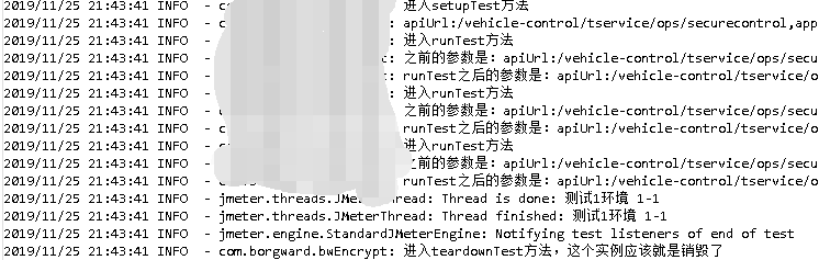(2)自定义的JavaSamplerClient类实例,被循环调用3次的日志输出如下,从日志可以看出,setupTest在线程开始创建自定义类的实例被调用时,循环的过程中只调用runTest方法,线程中该实例被销毁时才调用teardownTest方法