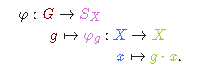 这一映射将群\(G\)中的每个元素\(g\)都对应到集合\(X\)上的一个置换\(\varphi_g\),且置换\(\varphi_g\)将\(x\)映射到\(g\cdot x\)。