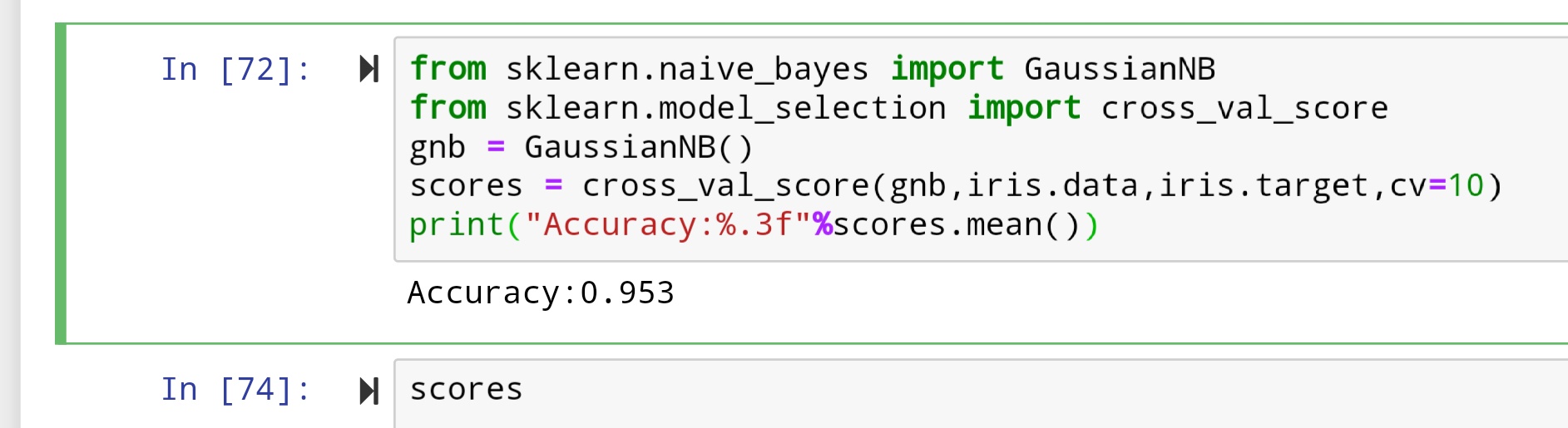 scores = cross_val_score(gnb,iris.data,iris.target,cv=10)