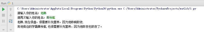 name1 = input("请输入你的姓名:") name2 = input("请再次输入你的姓名:") print('{},现在很虚,很需要补充营养,因为他昨晚熬夜,\n而他旁边的学霸{},也很需要补充营养,因为他昨夜也熬夜了。\n'.format(name1,name2,name1,name2)) input('press any key...')