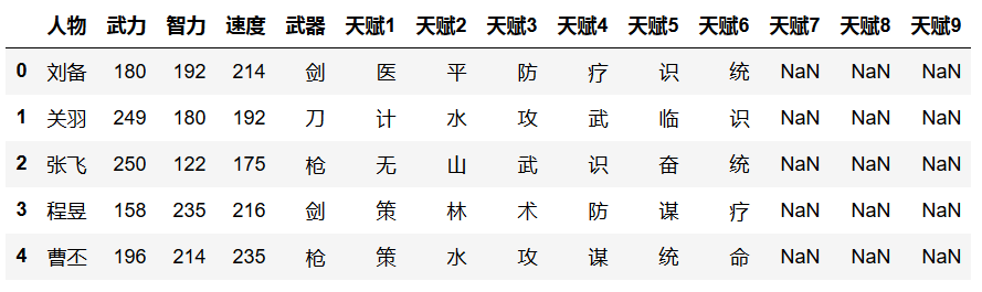 colnames=['人物','武力','智力','速度','武器','天赋1']+['天赋'+str(i) for i in range(2,10)]