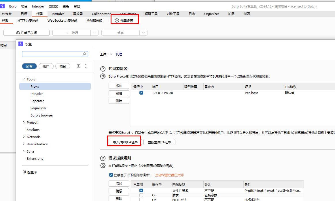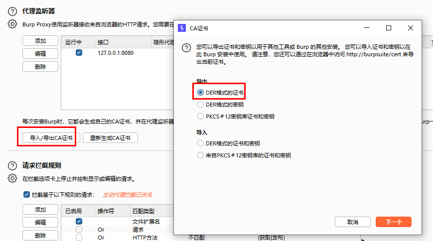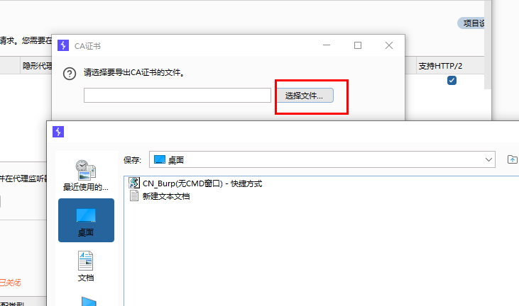 1.使用BurpSuite导出CA证书,文件导出到本地