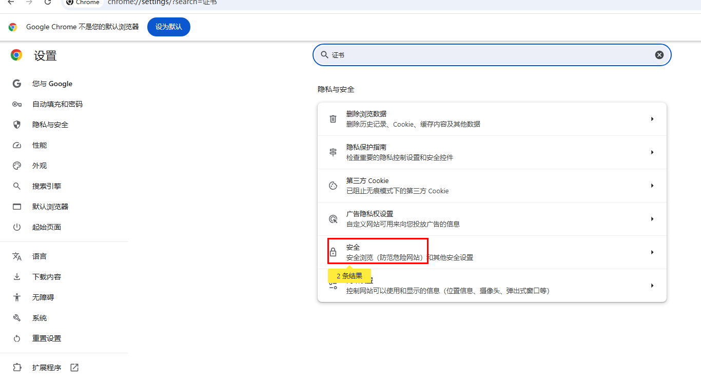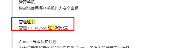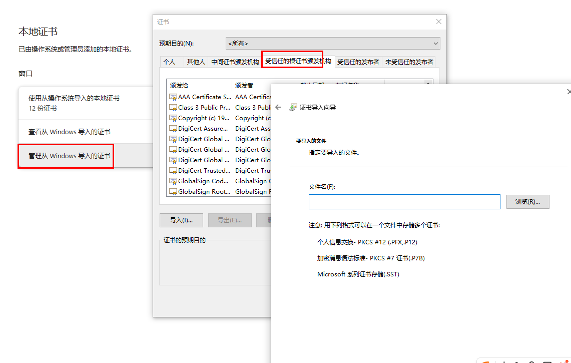 谷歌浏览器->设置->搜索"证书"->安全->管理证书->管理从windows导入的证书->受信任的根证书颁发机构->导入第一步的证书