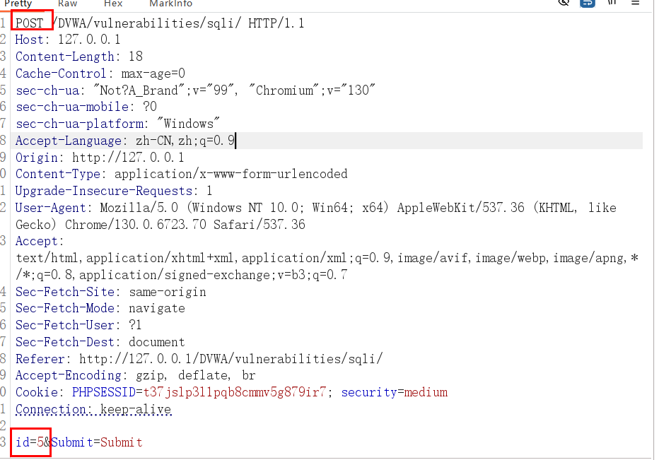 使用BP抓包,发现数据包为POST请求;在数据包中id=5 后按照Low 中的方法进行注入即可