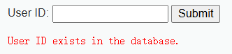 当输入 1'and length((select table_name from information_schema.tables where table_schema=database() limit 1,1))=5%23时,页面返回"User ID exists in the database.",说明第二个表名长度为5。