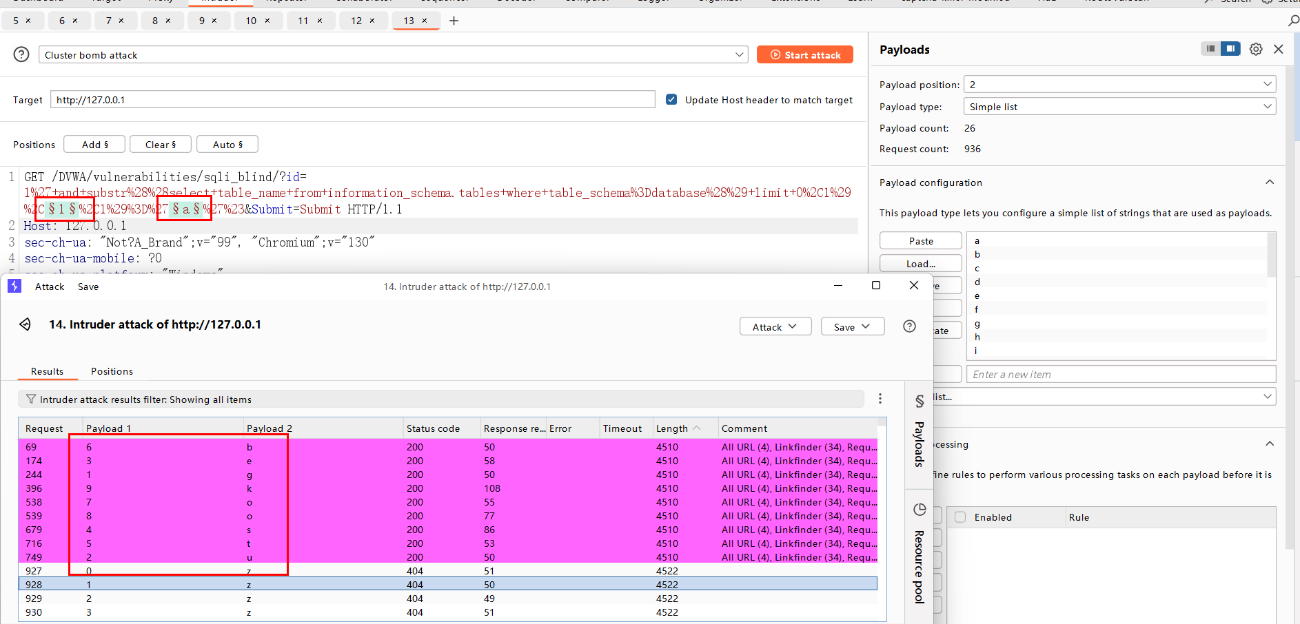 BP爆破表名,pos1遍历数据库名称长度,pos2 遍历所有可能为数据库名称的字符